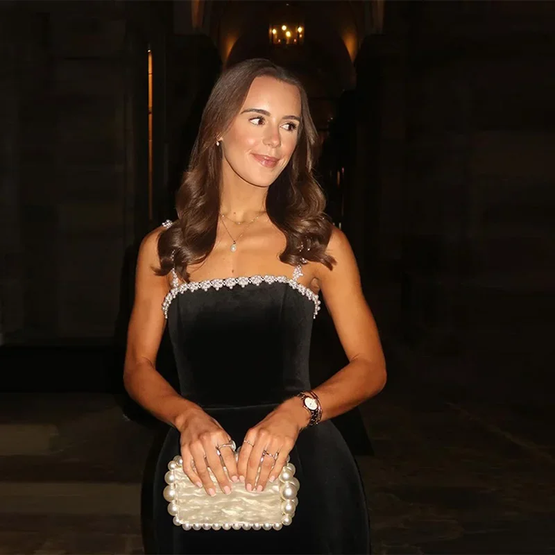 Elegant 3d Flower Pearl Slip Dress Black Slim Robe Lady